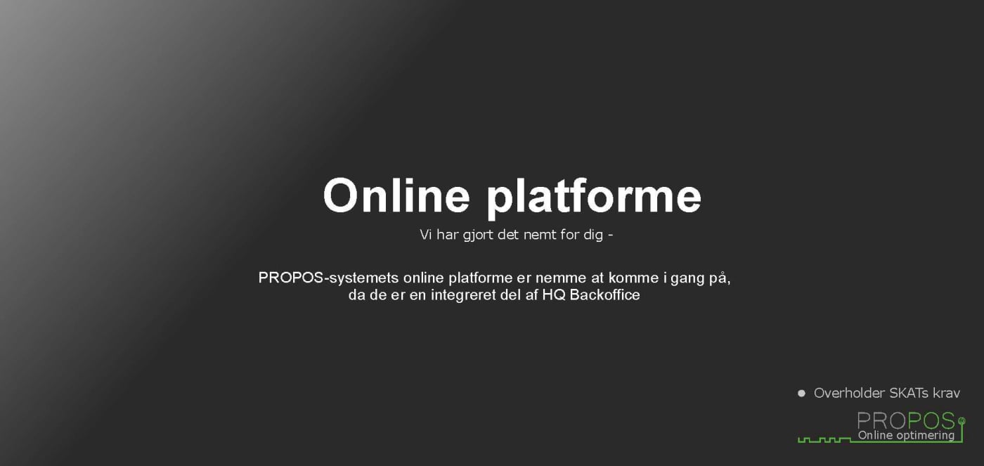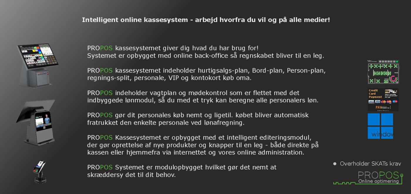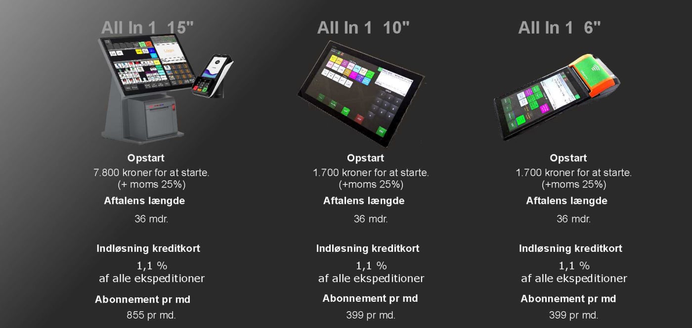 Som udgangspunkt skal dit udstyr være minimum følgende: Touchskærm, 4GB Ram, min. 120 GB HHD, Windows 7, 8, 10 el. Win7 PosReady, hvilket de fleste kassesystemer har.
